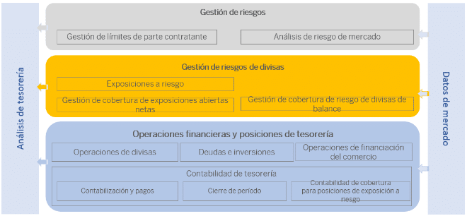 La solución SAP TRM está compuesta por un conjunto de submódulos o soluciones especificas, siendo el mas implementado de forma general el “Gestor de transacciones” (SAP TRM-TM), el cual permite la gestión de diferentes instrumentos financieros de inversión, deuda, divisas, derivados y valores.